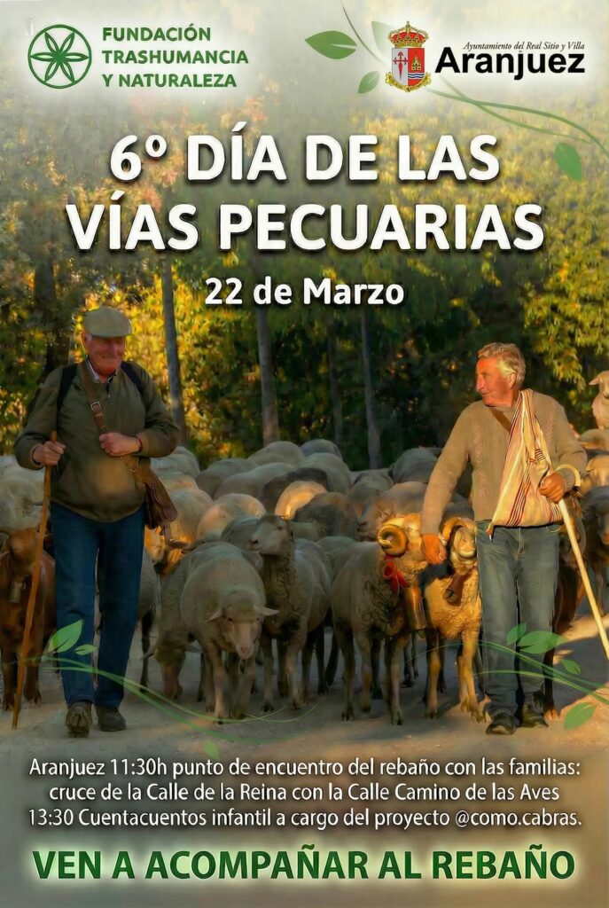 La Fundación Trashumancia y Naturaleza, en colaboración con el Ayuntamiento de Aranjuez y el proyecto @comocabras, celebra el VI Día de las Vías Pecuarias con una jornada de pastoreo, cultura y reivindicación.